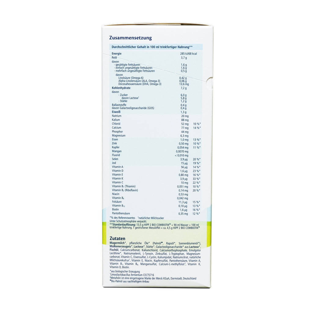Hipp 2 BIO Combiotik® milk contains lactic acid cultures, prebiotic fiber and vitamins A, C and D for a healthy immune system. Prebiotic fiber provides a healthy intestinal flora for breast-fed infants.