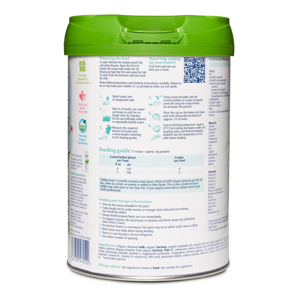 From 12 months onward, toddlers typically need around 350ml of HiPP Organic Stage 3 Growing Up Milk each day. This can be offered as a drink, poured over cereal, or mixed into their favorite foods. Please note this is a general guideline — your toddler’s needs may vary. For personalized advice, we recommend consulting your healthcare professional.